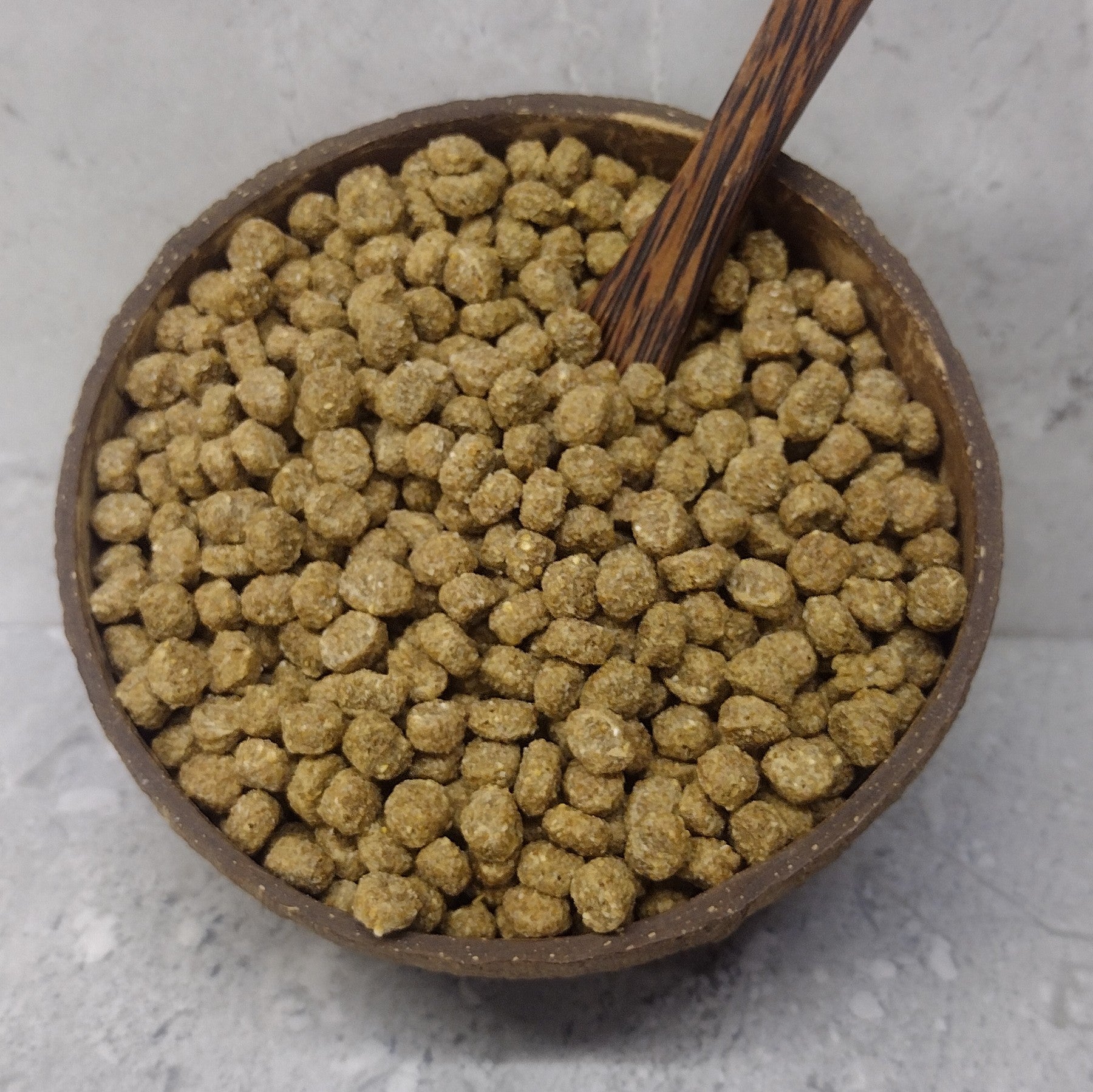 Composition: Wheat, Wheatfeed, Peas, Rice, Soya, Linseed, Fish Meal, Soya Oil. Added vitamins and minerals.